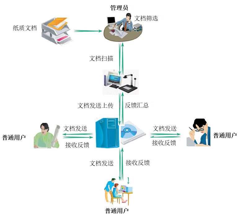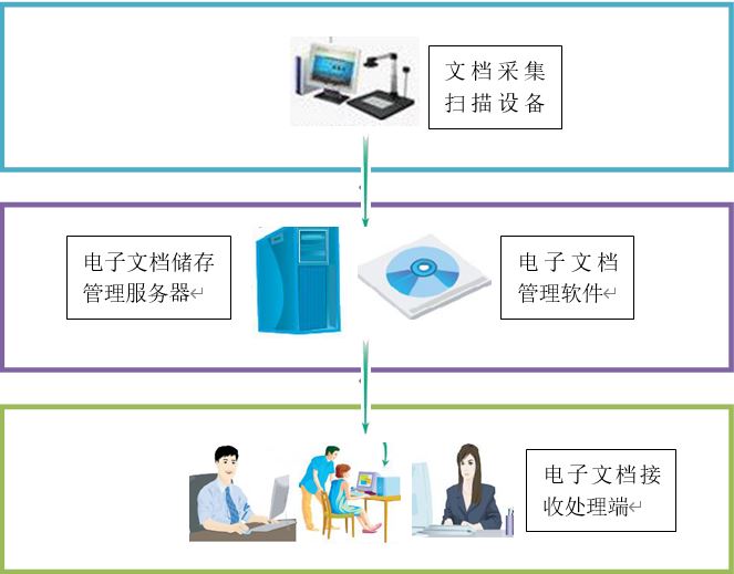电子文档管理系统主要由三部分组成:采集端,服务器端,用户端。